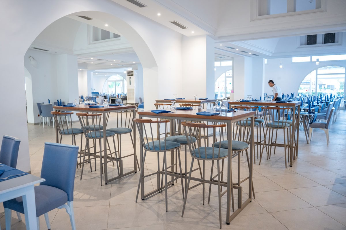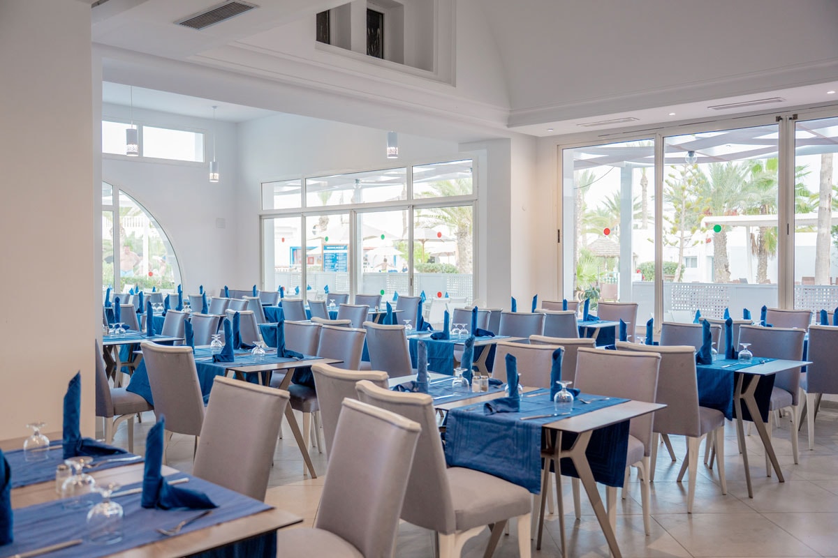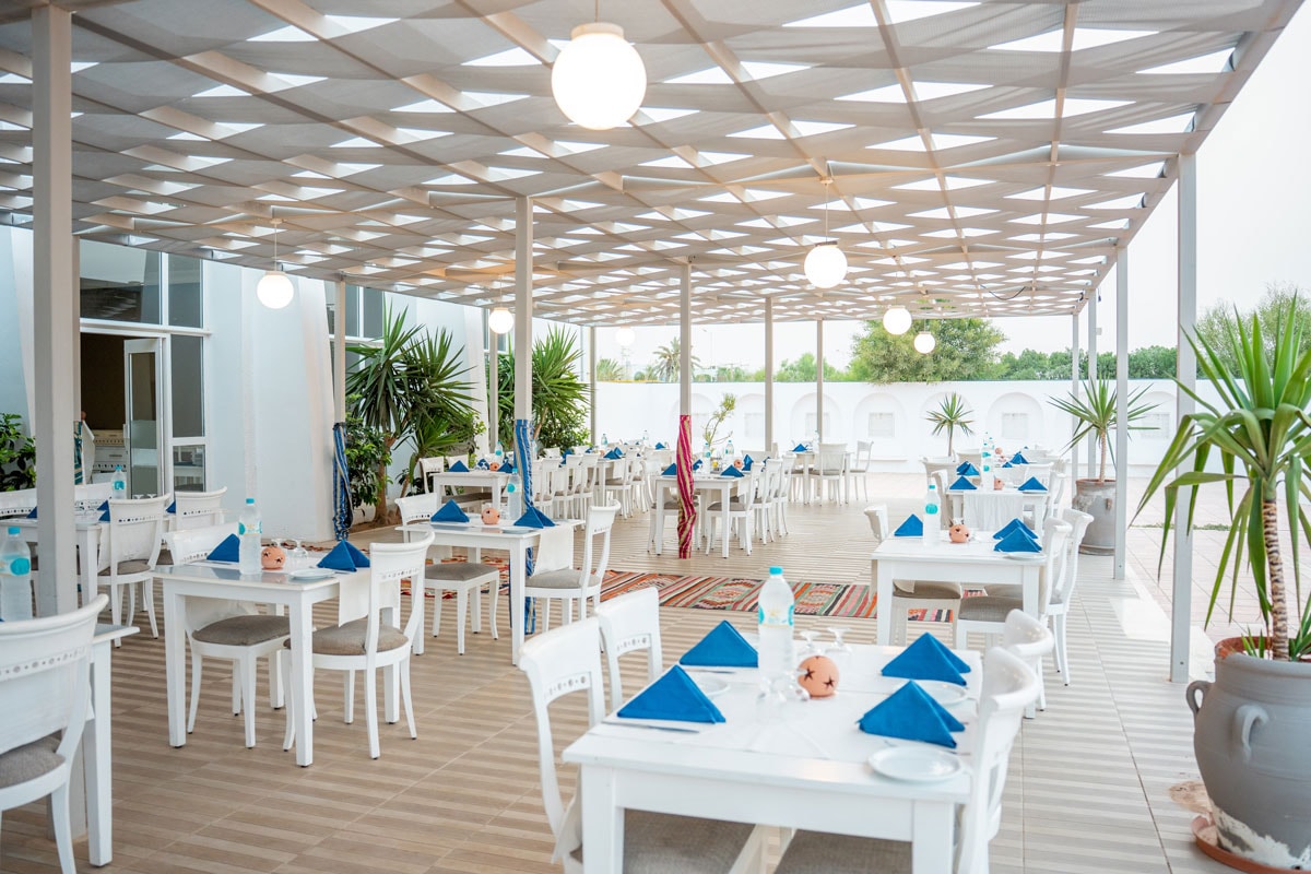 Le Club propose un restaurant principal, La Pergola, servi sous forme de buffet variés et à volonté (cuisine locale, buffet à thèmes, show cooking...), 1 Beach Snack Restaurant pour les petits creux. 1 restaurant à la carte, Le Riad, accessible une fois durant le séjour, réservation auprès de la réception. L'hôtel dispose également de 6 différents bars et cafés.